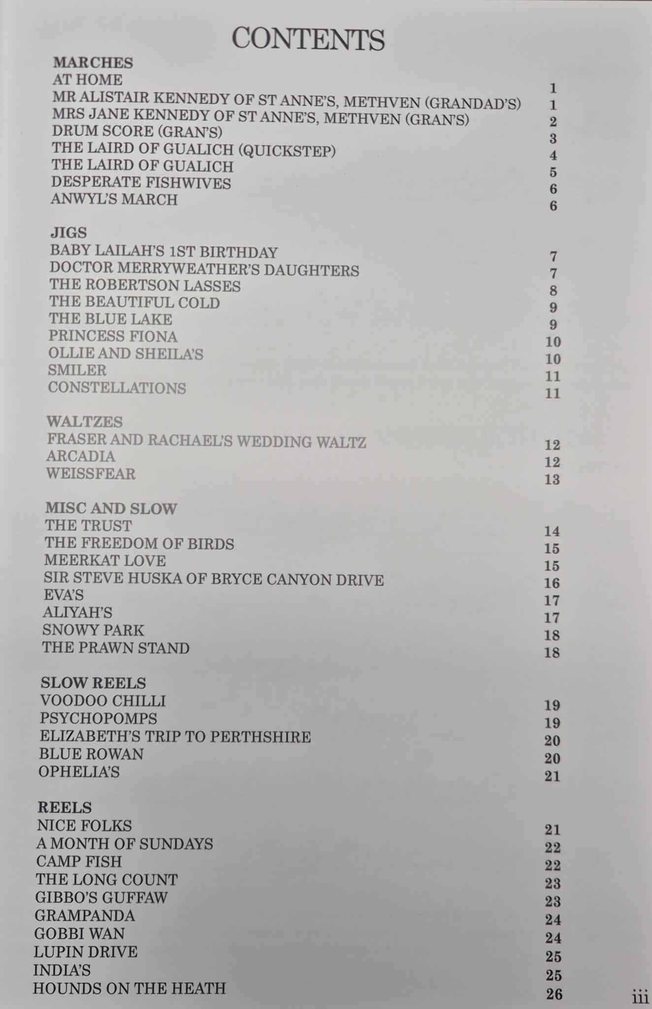 Die Sammlung enthält in etwa hälftig Stücke für die Great Highland Pipe und für andere Instrumente wie z.B. Whistles.