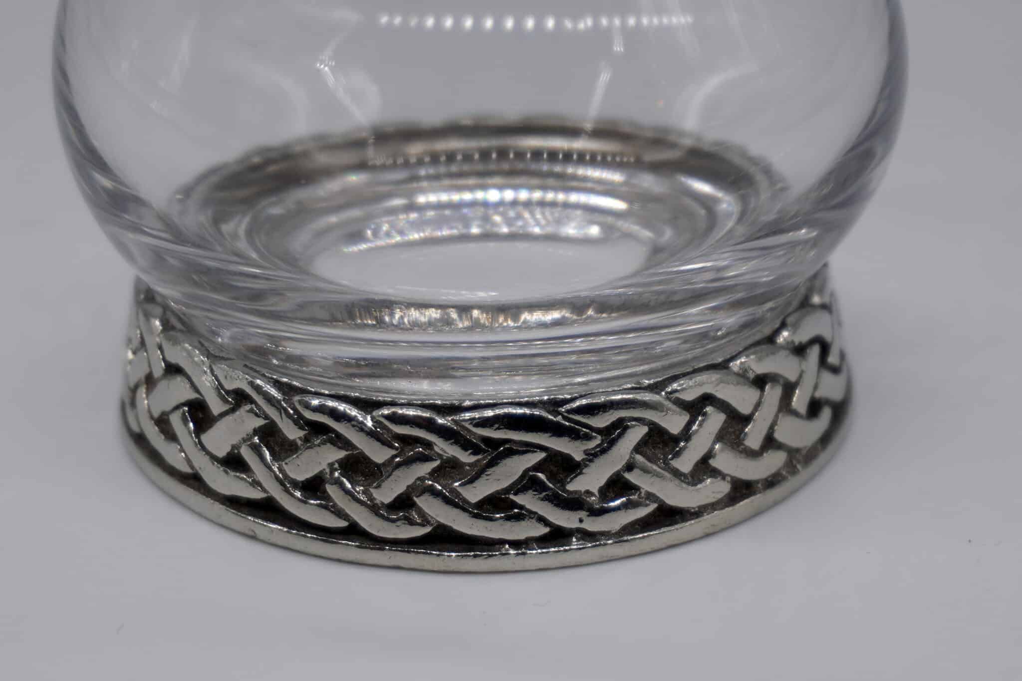 Whisky Tasting Glas aus mit Pewter-Fuß. Der Fuß ist mit einem keltischen Knotenmuster gestaltet.